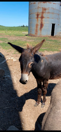 Up to date on vaccines dewormed and feet were done July 18th asking 1200 OBO. Donkeys are very social and loving creatures. Juno is a brown Standard donkey with a white chest belly and legs.